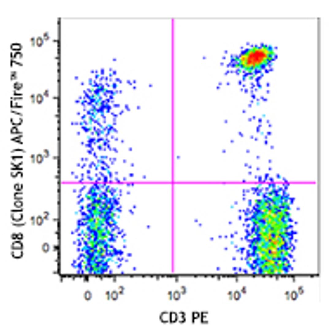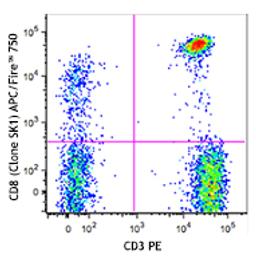 APC/Fire™ 750 anti-human CD8; Clone: SK1; Reactivity: Human, Cross-Reactivity: African Green, Chimpanzee, Cynomolgus, Pigtailed Macaque, Rhesus, Sooty Mangabey ; Apps: FC; Size: 25 tests