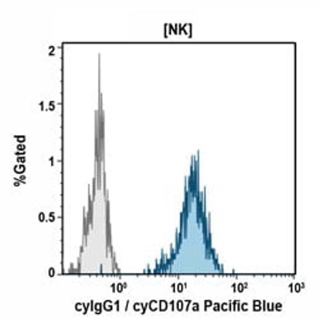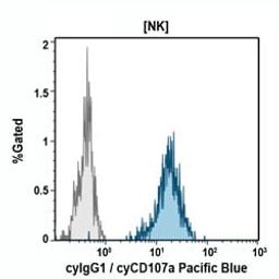 The CD107a antigen is the heavily glycosylated 110 kDa lysosomal-associated membrane protein, LAMP-1. Together with LAMP-2, they are the mayor glycoproteins on the membrane of lysosome granules. CD107a molecule is ubiquitously found as intracellular antigen. It is also expressed on the surface of activated platelets, PHA activated, a few monocytic cell lines, and fetal thymus stromal cells. It has been described as a marker of cytotoxic CD8+ Tcell degranulation and of NK cell functional activity. As platelet activation marker, it has characteristics of an adhesive molecule. A minor fraction (<2%) of LAMP-1 is associated with the plasma membrane of most nucleated cells, presumably as a result of selective exchange of lysosomal and plasma membranes. Increased surface expression of LAMP-1 has been observed on transformed cells of high metastatic potential, and on embryonic cells.*Alexa Fluor and Pacific Blue are registered trademarks of Molecular Probes, Inc.