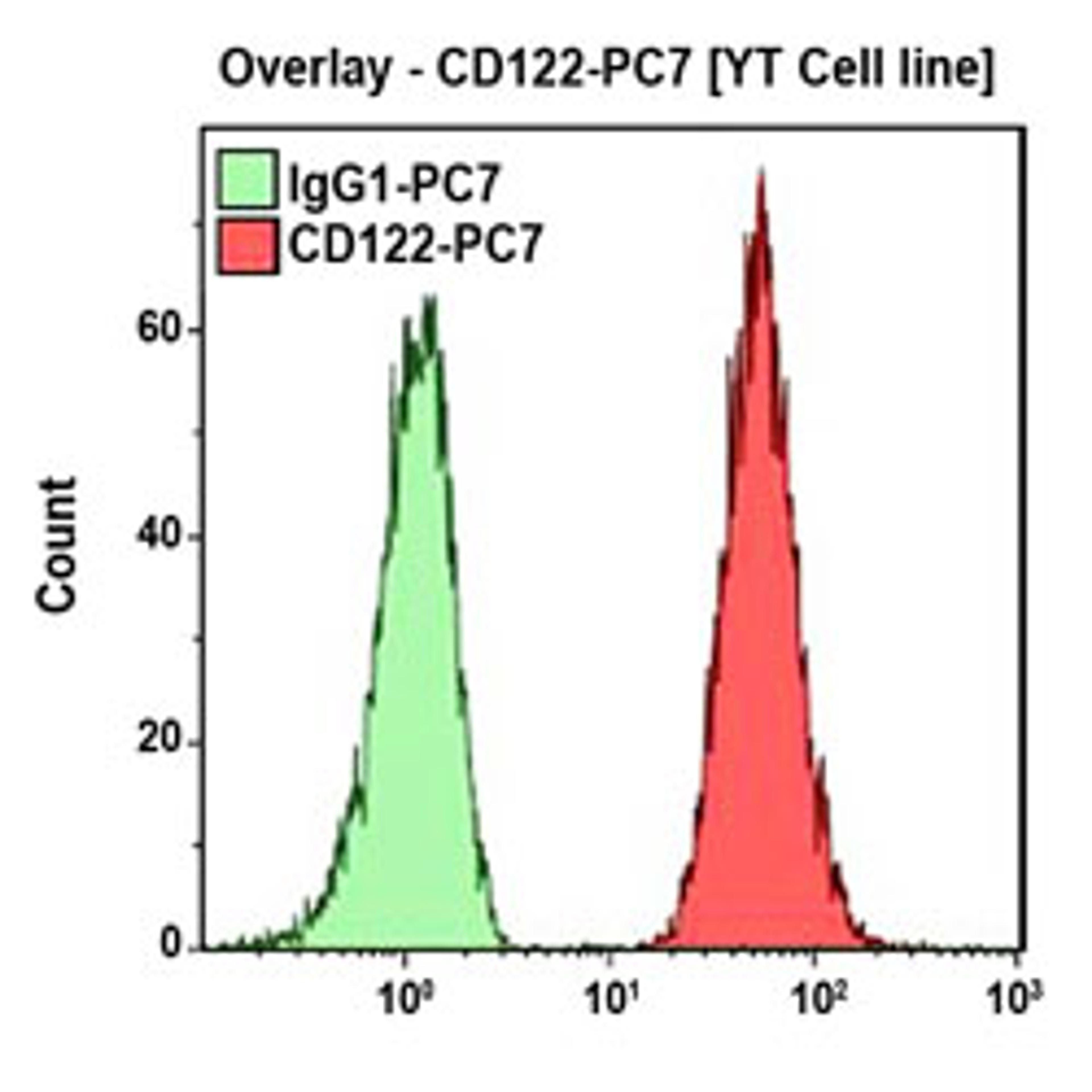 The CD122 antigen is the human IL-2 receptor β chain (p75). CD122 associates with CD25 and CD132 (IL-2Rγ) to form the IL-2 high affinity receptor. It is also a component of the IL-15 receptor. CD122 can directly bind IL-2 and is involved in IL-2 signal transduction. The CD122 antigen is expressed on NK cells, B and T lymphocytes and monocytes.