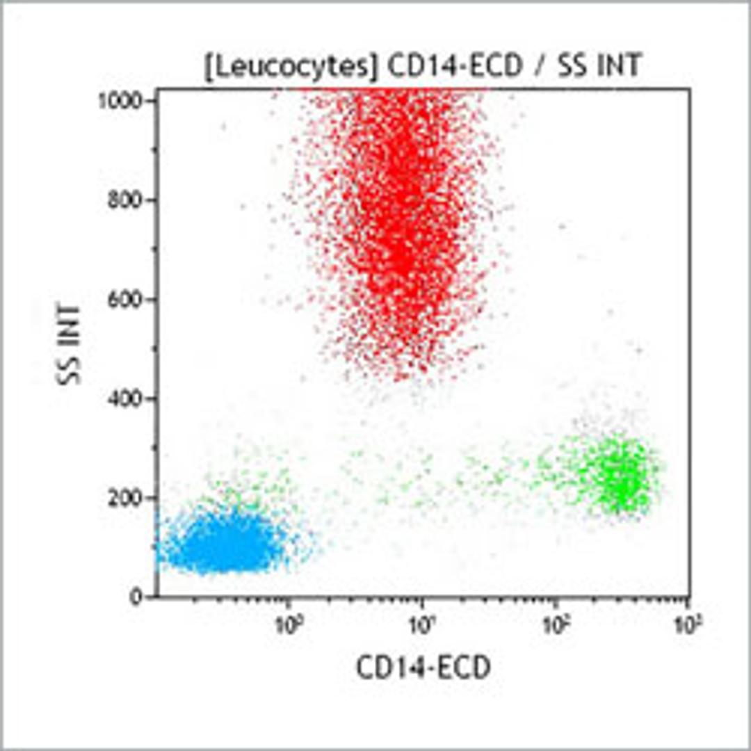 The CD14 antigen is a glycosyl-phosphatidylinositol-linked single-chain surface membrane glycoprotein with a molecular weight of 53-55 kDa. It functions as a high affinity receptor for the complex of LipoPolySaccharide (LPS) and the LPS-Binding Protein (LBP). It is found on cells of myelomonocytic lineage. CD14 antigen is strongly expressed on monocytes, macrophages, and weakly on neutrophils. It is also weakly expressed on B lymphocytes, but is absent from T lymphocytes, NK cells, red blood cells and platelets. It is found on Langerhans cells, follicular dendritic cells and histiocytes.