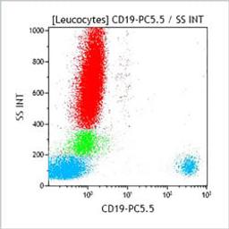 The CD19 antigen (also called B4) is a type I membrane glycoprotein with a molecular weight of 95 kDa. CD19 is involved in the regulation of B lymphocyte development, activation and differentiation. This molecule is expressed on all normal B lymphocytes including pro-B lymphocytes. It is also found on the surface of follicular dendritic cells, on the early cells of myelomonocytic lineage and on most stabilized B cell lines. It is not present on normal T lymphocytes, NK cells, monocytes, and granulocytes.