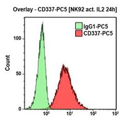 CD337, also known as NKp30, is a 30-kDa transmembrane glycoprotein which is a NK-specific triggering receptor involved in non-MHC-restricted natural cytotoxicity. NKp30 is strictly expressed by all resting and activated NK cells including the minor CD3–CD56brightCD16– subset. With NKp46 and NKp44 it is one of the three identified NK natural cytotoxicity receptors (NCR). Its surface expression parallels that of NKp46. NKp46dull NK cells are also characterised by a NKp30dull phenotype while NKp46bright NK cells show a NKp30bright phenotype. The NKp30bright or NKp30dull phenotypes are correlated with high or low cytotoxicity, respectively. CD337 is a member of the immunoglobulin superfamily characterized by a single extracellular V-type Ig-like domain. It is associated with a homodimer of ITAM motif-containing CD3ζ adaptor proteins. These adaptor proteins are not necessary for surface expression of NKp30, but are necessary for signal transduction. In redirected killing assays, Z25-mediated cross linking of NKp30 induces strong NK cell activation. Conversely, Z25-mediated masking of NKp30 inhibits NK cytotoxicity against target cells. More importantly, CD337 represents the major receptor in induced NK-mediated killing of certain target cells, the lysis of which is largely NKp46 / NKp44 independent. Although the CD337 ligand is unknown, studies report NKp30-mediated lysis of immature dendritic cells (iDC). These findings suggest that DCs express one or more unidentified ligands for CD337.