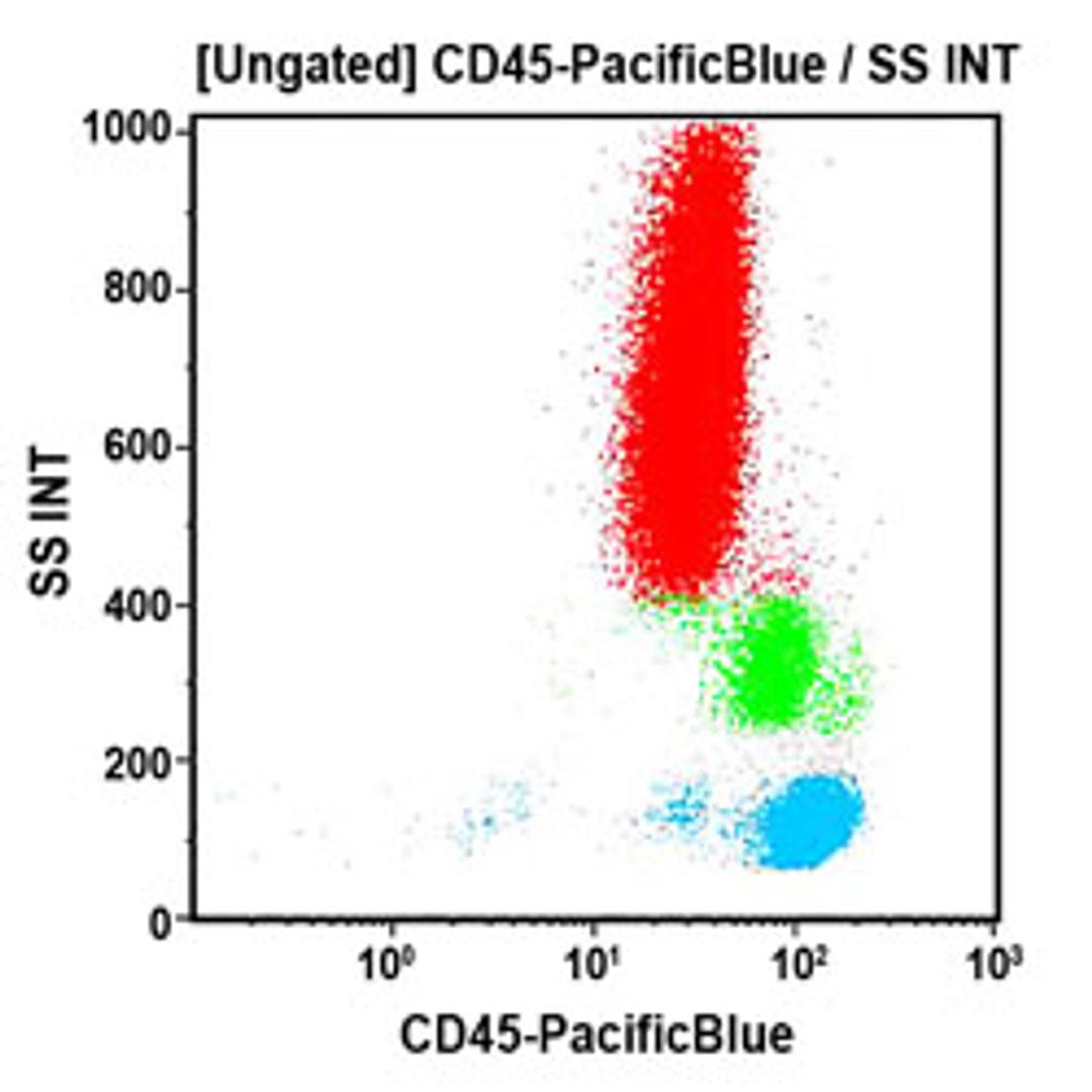 The CD45 molecules are single chain integral membrane proteins comprising at least five isoforms ranging from 180 to 220 kDa. They are generated by alternative splicing combinations of three exons (A, B, and C) of the genomic sequence. The non-restricted CD45, Leucocyte Common Antigen (LCA) consists of an extracellular sequence, proximal to the membrane, which is common to all CD45 isoforms. All the monoclonal antibodies that belong to the CD45 cluster react with this part of the antigen and are able to recognize all CD45 isoforms. These isoforms have extracytoplasmic sequences ranging from 391 to 552 amino acids long with numerous N-linked carbohydrate attachment sites. The cytoplasmic portion contains two phospho-tyrosine-phosphatase domains. The non-restricted CD45 epitope is present on the surface of all human leucocytes, lymphocytes, eosinophils monocytes, basophils and neutrophils by order of decreasing level of expression. CD45 is a major component of the lymphocyte membrane. It is absent from erythrocytes and platelets. It is lost during maturation of erythroid cells in the bone marrow. CD45 antibodies react with leucocyte progenitors in bone marrow.*Alexa Fluor and Pacific Blue are registered trademarks of Molecular Probes, Inc.