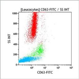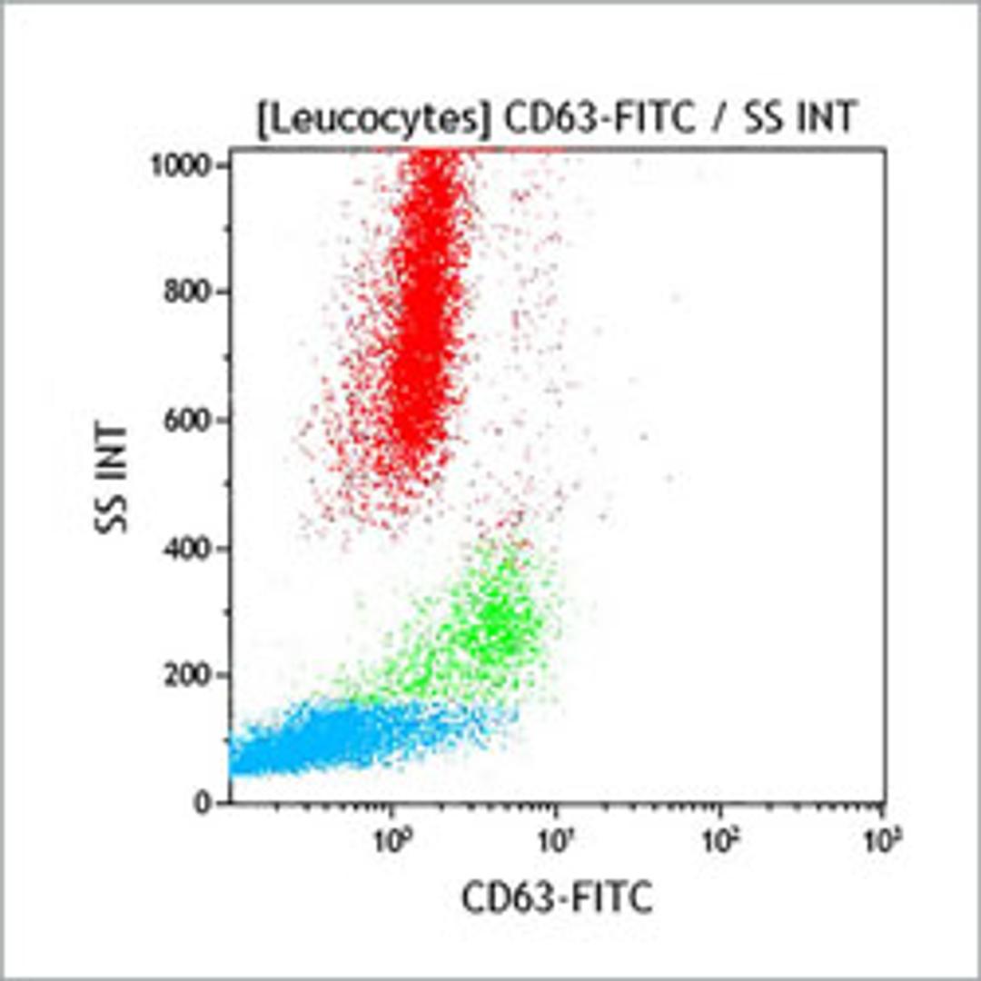 The CD63 antigen, also known as lysosomal membrane associated glycoprotein 3 (LAMP3), is a member of the tetraspanin (TM4SF) family. Nearly 20 genes encode tetraspanins whose main structural characteristics is their four transmembrane domains. CD63, as other tetraspanins (CD9, CD81, CD82), has recently been reported as forming complexes with VLA-3 and phosphatidylinositol 4-kinase, with VLA-6, CD11/CD18 and tyrosine kinase. CD63 was first described in granules of resting platelets and on the surface membrane on activated platelets. CD63 was later identified as granulophysin, a platelet dense granule glycoprotein. The molecular weight of the platelet form of CD63 ranges from 40 to 55 kDa. CD63 has been found to be identical to the ME491 antigen expressed by melanoma cells. It is also found on monocytes / macrophages and is weakly expressed by resting granulocytes, T lymphocytes and B lymphocytes. CD63 antigen, present in azurophilic granules of non-stimulated neutrophils, is strongly expressed on the surface of neutrophils after activation. Studies have shown that CD63 may be a marker for granule release. This phenomenom is also reported for basophils.