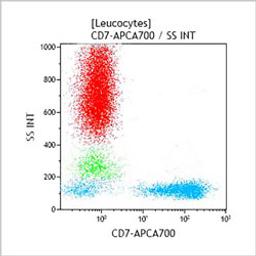 The CD7 antigen is a membrane-embedded glycoprotein with a molecular weight of 40 kDa. It is expressed at an early stage of T lineage ontogeny, during the extrathymic prothymocytic formation. CD7 expression persists throughout T lymphocytes differentiation defining CD7 as a pan-T marker. It is also expressed on thymocytes, on the majority of resting T lymphocytes, and Natural Killer cells (NK), and on a subset of pre-B lymphocytes and B lymphocytes from foetal bone marrow. CD7 expression is also detected on pluripotent hematopoietic stem cells. Mature B-lymphocytes, cells from erythroid, myeloid and megacaryocytic lineage do not express the CD7 molecule. The CD7 molecule is involved in T lymphocytes activation. Its expression may be quantitatively up-regulated on stimulated T lymphocytes.*Alexa Fluor and Pacific Blue are registered trademarks of Molecular Probes, Inc.
