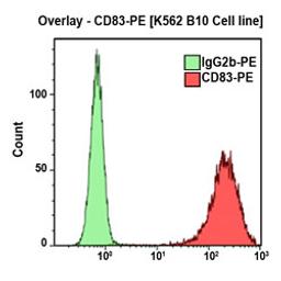 CD83, or HB15 molecule, is a 43 kDa glycoprotein member of the immunoglobulin superfamily. It is composed of a single extracellular V-type Ig-like domain, a transmembrane region and a 40 amino acid cytoplasmic domain. CD83 is predominantly expressed by dendritic lineage cells including Langerhans cells, skin and peripheral blood dendritic cells. It is also expressed by interdigitating reticulum cells present in the T cell zones of lymphoid organs as well as being weakly expressed by some germinal center lymphocytes. CD83 is expressed by in vitro generated dendritic cells. It is not expressed by resting peripheral blood leucocytes at detectable levels and is only expressed at low levels following lymphocyte activation in vitro.