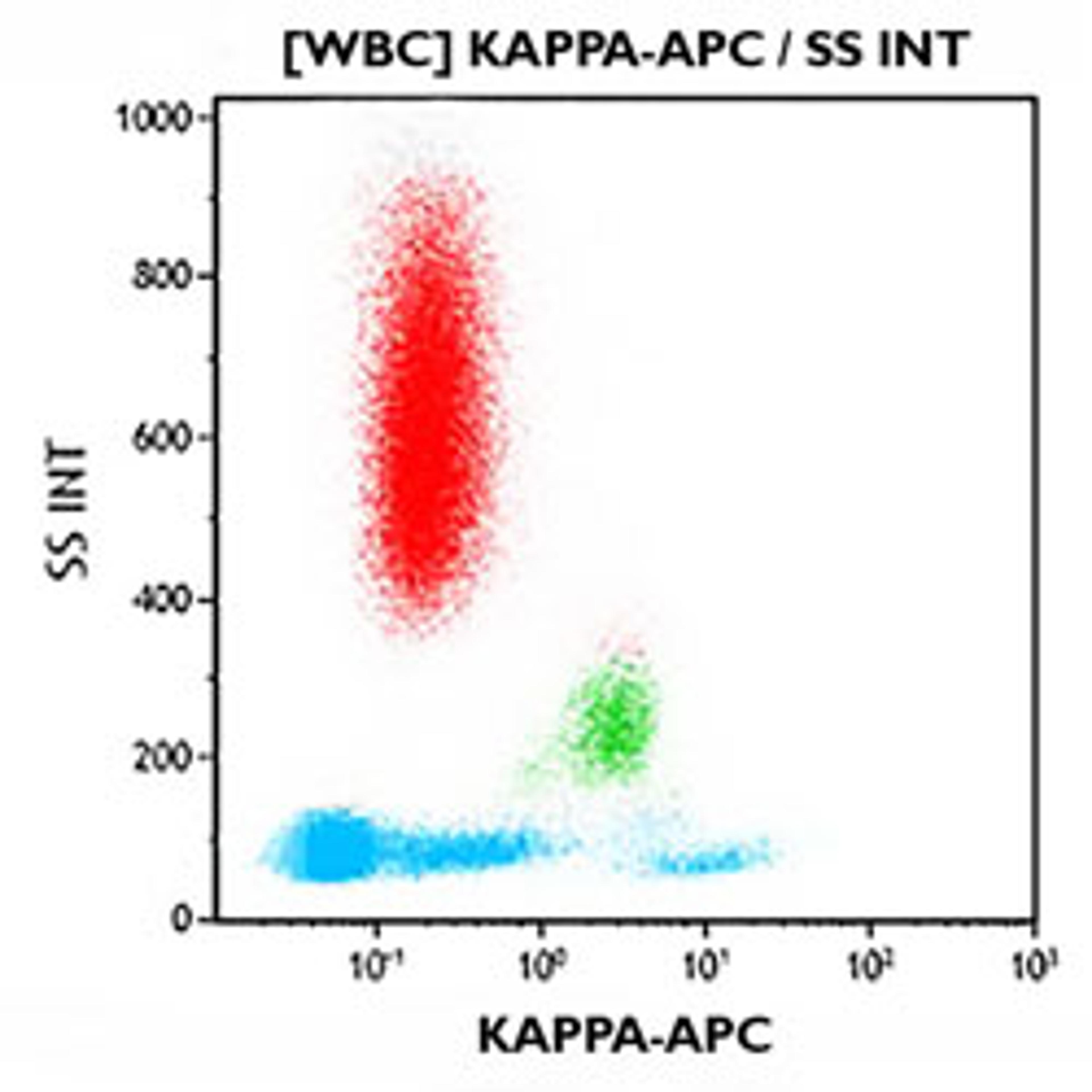 Kappa (κ) chain is a 25Kd polypeptide that results from papain cleavage of the IgG molecule, encoded by the human immunoglobulin kappa locus (IGK) on chromosome 2. The subunit structure of IgG comprises 2 light chains and 2 heavy chains. Each light chain is composed of two tandem immunoglobulin domains: a) one variable domain (VL) and b) one constant (CL) domain. While the VL show considerable sequence diversity the CL shows internal homology with repeating units. Anti-Kappa antibodies recognize the Kappa light chain of immunoglobulins expressed at the surface of a cellular subpopulation corresponding to approximately 2/3 of mature B lymphocytes in peripheral blood. This light chain is also found on the surface of a sub-population of immature bone marrow B lymphocytes.