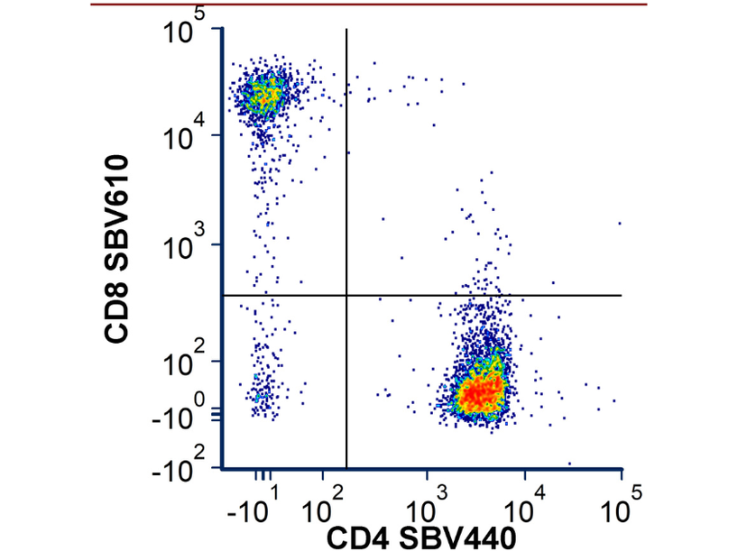 Flow cytometry plot depicts human peripheral blood stained with antibodies against CD8 and CD4 to identify T helper and T cytotoxic cells. CD8 was labelled with SBV610 and CD4 with SBV440 using the TrailBlazer Antibody labelling Kit.