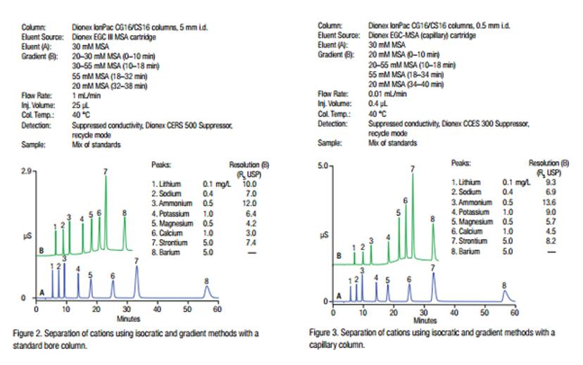 Figure 2: Separation of cations using isocratic and gradient methods with a standard bore column and a capillary column2