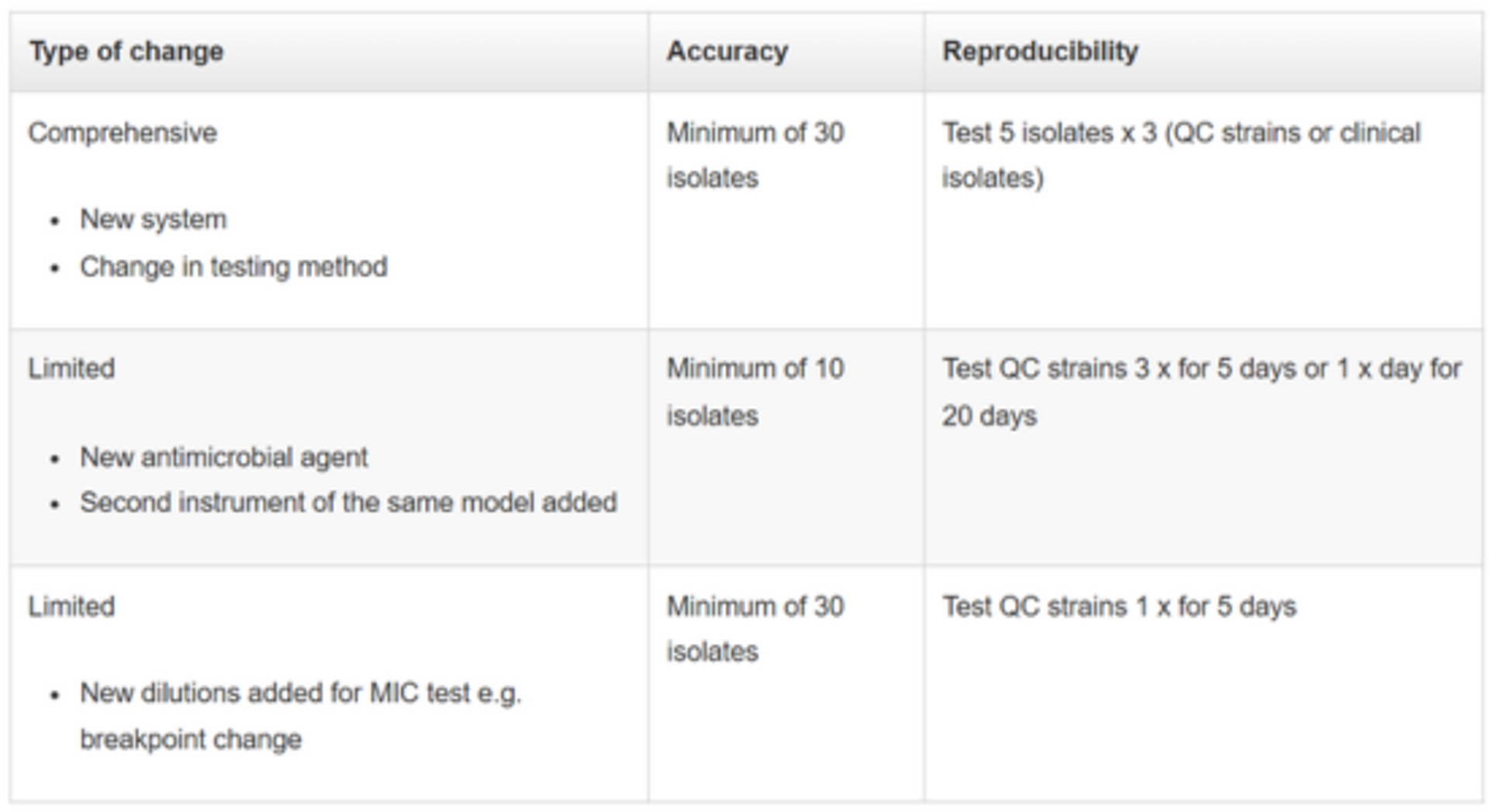Comprehensive and limited verification are performed by testing accuracy and reproducibility but the number of isolates tested varies; comprehensive verification would be performed in the event of a new system or change in method while limited verification is sufficient when introducing a new antimicrobial agent within an existing method, for example.