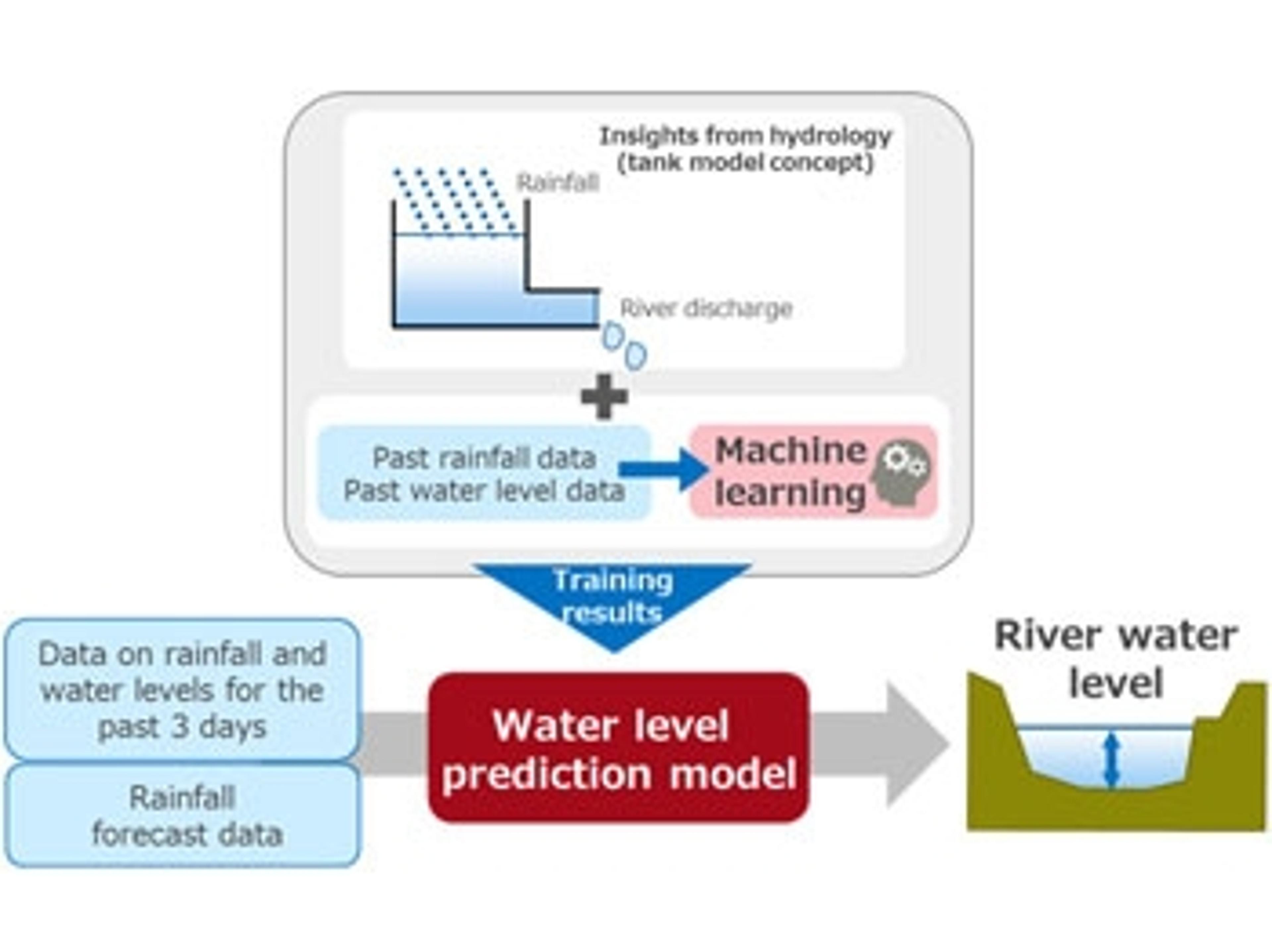 Fujitsu technology utilizes mathematical models that incorporate rainfall and water level data for more precise predictions