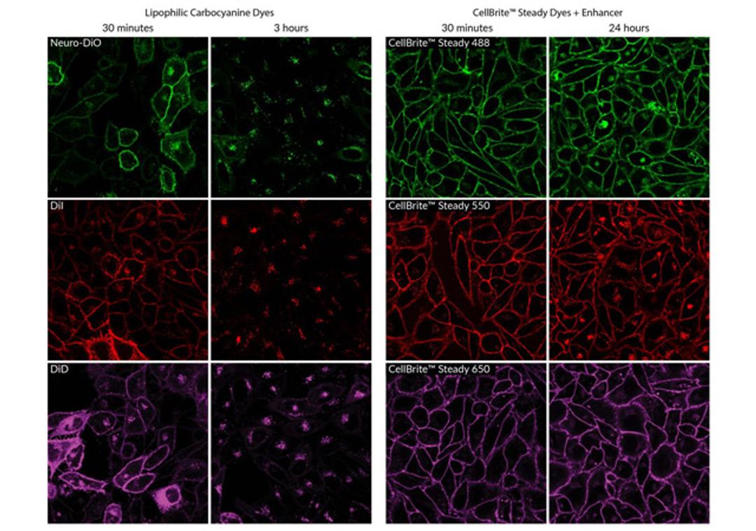 CellBrite® Steady Membrane Staining Kits allow fluorescence imaging of cell surface for up to several days in culture. The CellBrite® Steady Dyes are unique fluorescent membrane probes that distribute between the cell surface and intracellular compartments, so cells retain cell surface staining over time. With the use of CellBrite® Steady Enhancer, intracellular staining can be reduced or eliminated for imaging of cell outlines or boundaries.