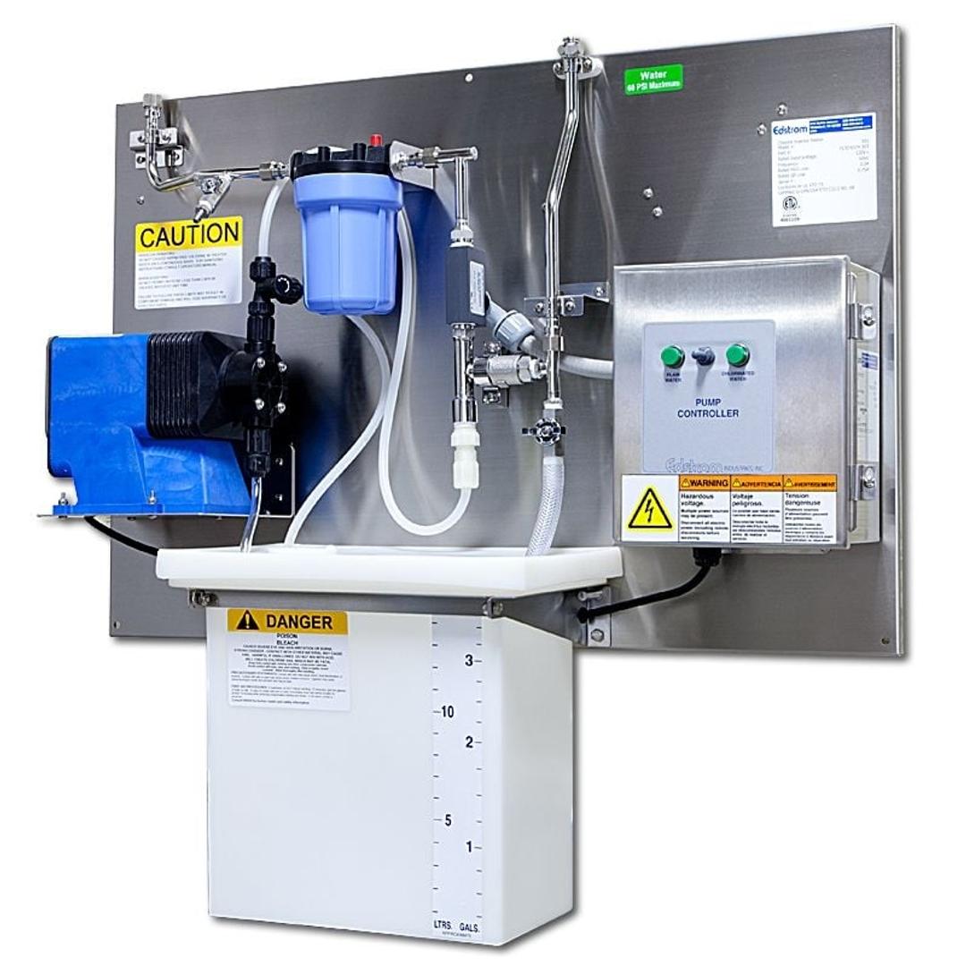 The Chlorine Injector Station (CIS) is used in automated watering systems for laboratory animals and is a panel-mounted assembly that adds chlorine to water used for Recoil Hose Flush Stations (RHFS), Reverse Osmosis Systems, and other applications which have a stable water flow. This station is also suitable for acidification applications.