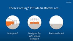 Polyethylene terephthalate (PET) bottles are ideal for storage and sampling of media, biologicals, and other aqueous solutions. The PET resin makes the bottle lightweight, break resistant and as transparent as glass.