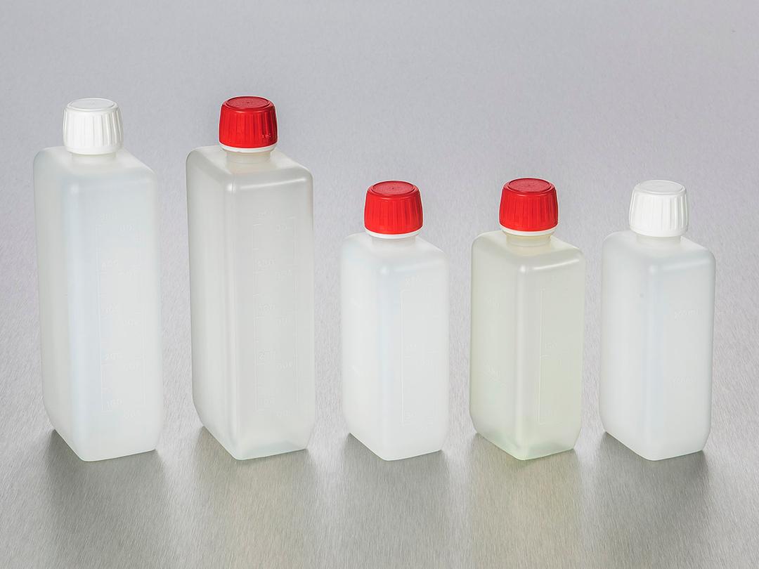 Break-resistant and translucentReverse graduationsTamper-evident High-density Polyethylene (HDPE) caps with sealBulk-packed in folded outer bag