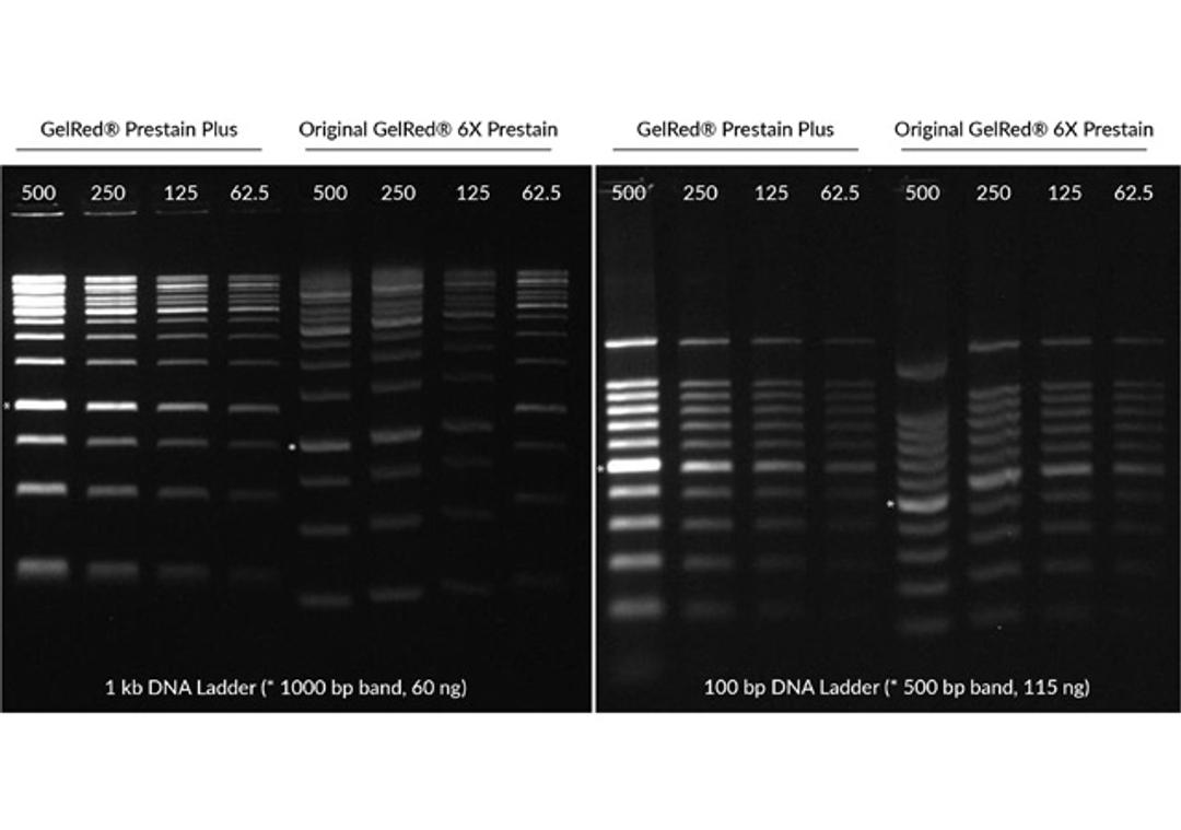 This product is an improved version of our original 6X GelRed® Prestain Loading Buffer (catalog number 41009) with brighter signal and more consistent DNA migration. When DNA is bound to GelRed® before electrophoresis, the ratio of dye to DNA can cause variable shifts in DNA migration, making it difficult to compare DNA fragment sizes between samples. GelRed® Prestain Plus 6X DNA Loading Dye is formulated to minimize this DNA migration shift, for greater consistency. GelRed® prestaining is simple and can avoid migration issues seen with GelRed® precast gels.