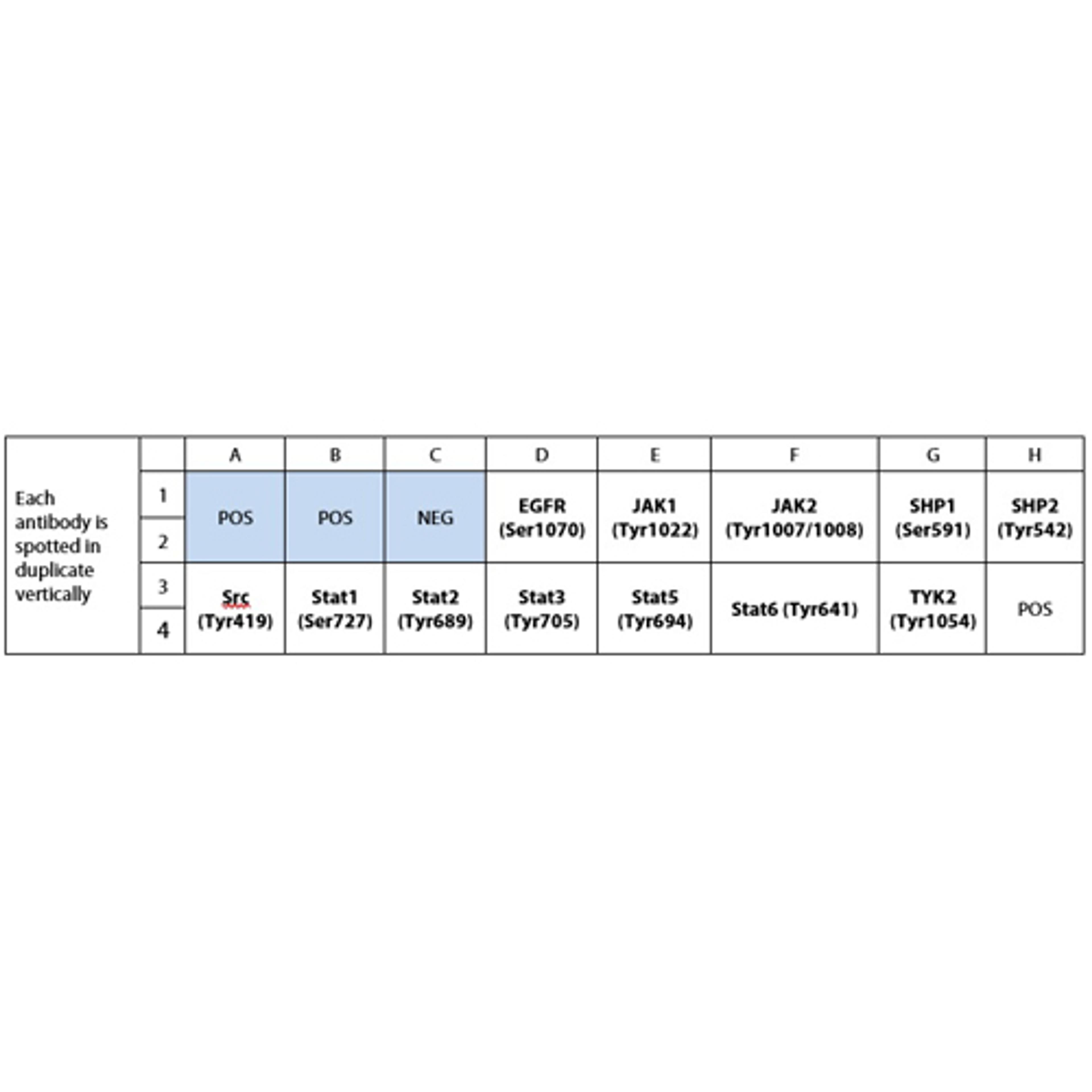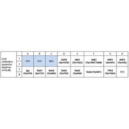 EGFR (P-Ser1070), JAK1 (P-Tyr1022), JAK2 (P-Tyr1007/1008), SHP-1 (P-Ser591), SHP2 (P-Tyr542), Src (P-Tyr419), STAT1 (P-Ser727), STAT2 (P-Tyr689), STAT3 (P-Tyr705), STAT5 (P-Tyr694), STAT6 (P-Tyr641), TYK2 (P-Tyr1054)