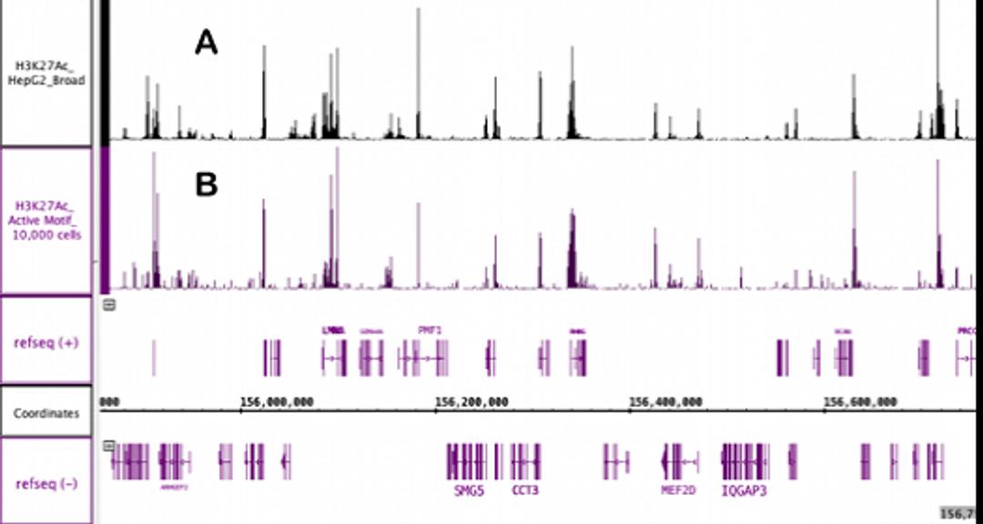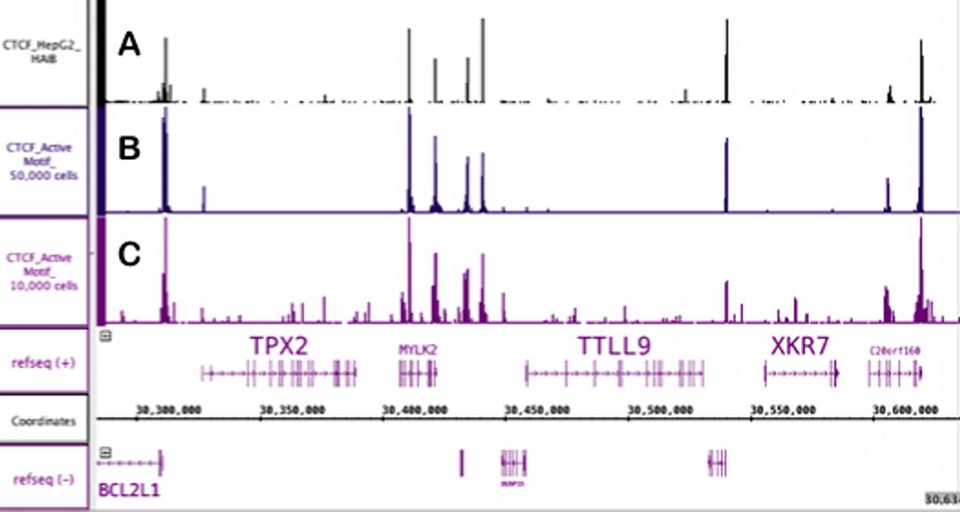 Active Motif’s Epigenetic Services group has made significant improvements to our ChIP-Seq protocols and pipeline, and as a result, we have reduced starting material requirements by 1,000 fold! Our team can now generate genome-wide binding profiles using as few as 10,000 cells.