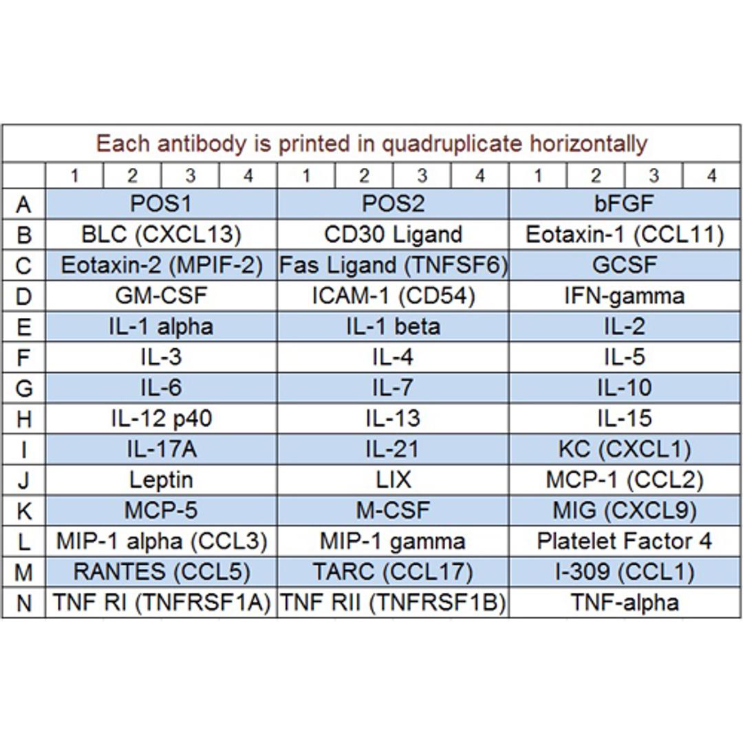 bFGF, BLC (CXCL13), CD30 Ligand (TNFSF8), Eotaxin-1 (CCL11), Eotaxin-2 (MPIF-2/CCL24), Fas Ligand (TNFSF6), GCSF, GM-CSF, ICAM-1 (CD54), IFN-gamma, IL-1 alpha (IL-1 F1), IL-1 beta (IL-1 F2), IL-2, IL-3, IL-4, IL-5, IL-6, IL-7, IL-10, IL-12 p40, IL-13, IL-15, IL-17A, IL-21, KC (CXCL1), Leptin, LIX, MCP-1 (CCL2), MCP-5, M-CSF, MIG (CXCL9), MIP-1 alpha (CCL3), MIP-1 gamma, Platelet Factor 4 (CXCL4), RANTES (CCL5), TARC (CCL17), I-309 (TCA-3/CCL1), TNF alpha, TNF RI (TNFRSF1A), TNF RII (TNFRSF1B)