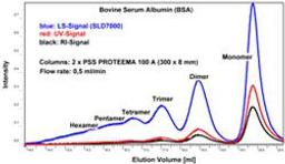 Proteema is the right choice for the separation of all kinds of biomolecules including proteins and gelatines. The columns are silica based and can be used with eluents up to a pH value of 7. If the application requires separations at higher pH in more ‘basic’ eluents, PSS SUPREMA a polymer based material is recommended. Generally the pore-size distribution of silica based columns is smaller than that of polymeric columns, whi…