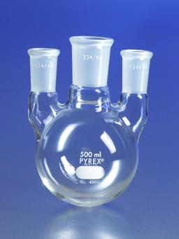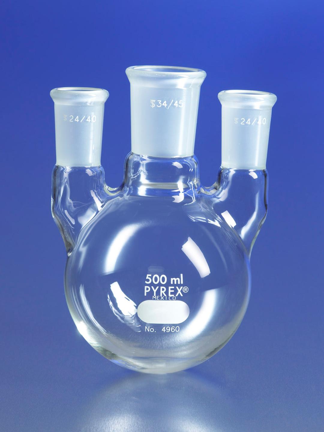These 2L PYREX® three neck flasks have two vertical side necks with 24/40 full length outer Standard Taper joints and a larger vertical center neck with a full length 45/50 Standard Taper joint.