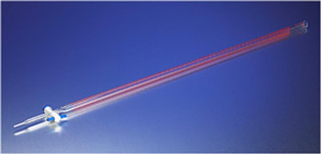 The capacity tolerance on this Class A 50 mL PYREX® buret is established by ASTM E-287 and is calibrated in accordance with ASTM E-542. Tips are carefully drawn from accurate bore tubing to insure proper drainage rates. This buret has colored markings, fine, sharp lines and large easy-to-read numbers. The stopcock barrel has a smooth micro-finish to assure leak-resistant performance. Each buret is supplied with a dust cover. All sizes are furnished with a 2mm bore Product Standard PTFE (Polytetrafluorethylene) stopcock plug. For a replacement PTFE stopcock plug only, see No. 7681-2.