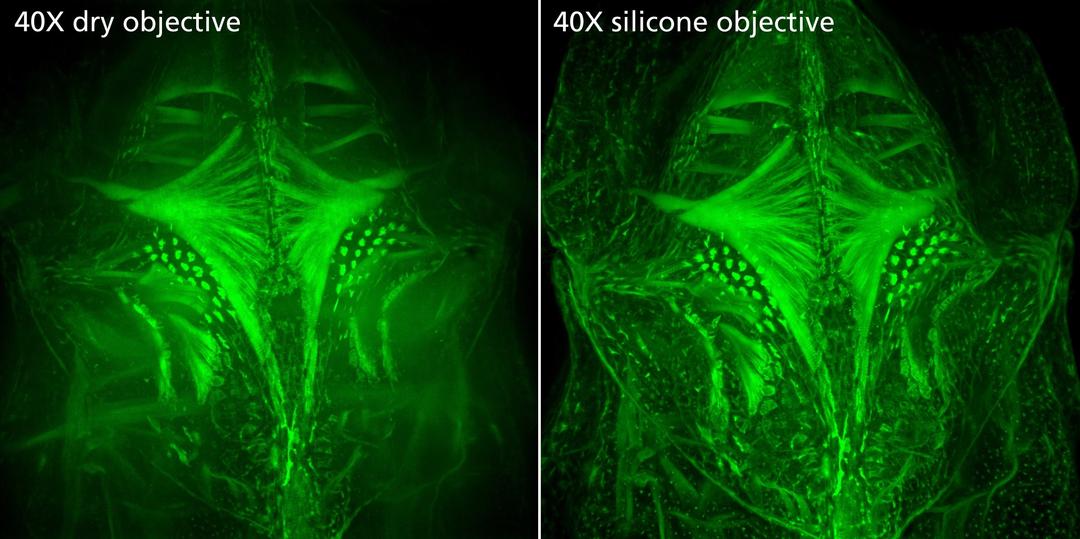 This unique series of objective lenses provides superior depth and resolution performance for biological imaging at multiple magnifications by more closely matching the refractive index of cells and tissues. Nikon silicone objectives are perfect for live-cell applications, especially in complex 3D structures, for long-term, time-lapse, real-time experiments. All three silicone objectives are bright, aberration-free, and support more accurate morphological and intensity based quantifications. Last but not least, they are suitable for 25 mm FOV with excellent spectral correction.