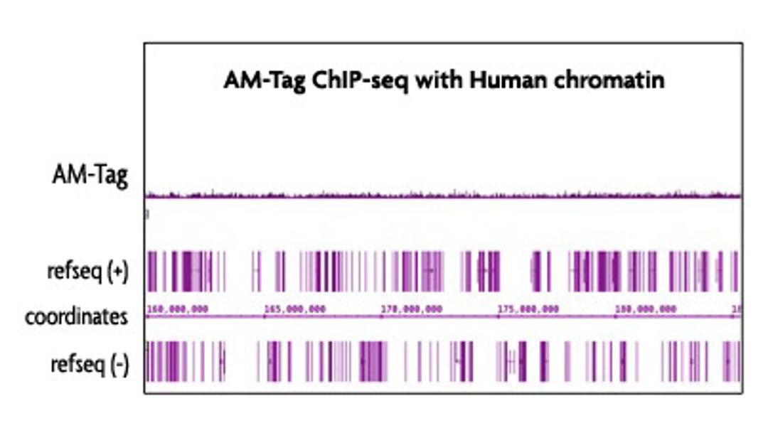 The AM-tag is specifically designed to minimize cross-reactivity with mammalian samples, thereby reducing background signal. Another benefit of the AM-tag is that the sequence is unstructured which allows the tag to protrude from the protein of interest for maximum exposure during the immunoprecipitation. This increases enrichment efficiency by allowing even low abundance transcription factors to be detected. Simply clone the AM-tag in frame with the C-terminus of your protein of interest in the expression vector of your choice. Following transfection and expression of your tagged protein, the Tag-ChIP-IT Kit can be used to isolate chromatin and perform immunoprecipitation using an antibody directed against the AM-tag.