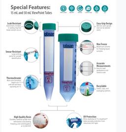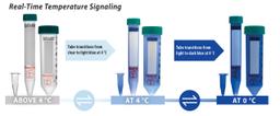 ViewPoint™ thermochromic centrifuge tubes provide real-time temperature signaling. ViewPoint™ tubes transition from clear to blue when exposed to cold temperatures. This multi-step and reversible thermochromic transition offer real-time temperature signaling to indicate sample fluctuations above and below 4°C. Offered in 1.5 mL, 15 mL, and 50 mL size tubes. Patents Pending.